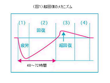 (図1)を見てください。まず(1)では、トレーニング直後、筋肉は傷つき疲労状態に